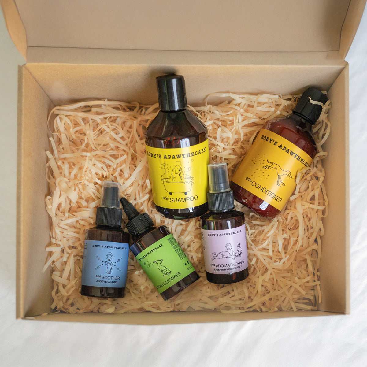An all-in-one, single-brand at-home grooming set for bath time, between-bath refreshes, ear care, and soothing dry paws or minor irritations.